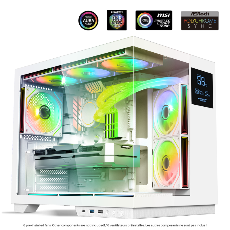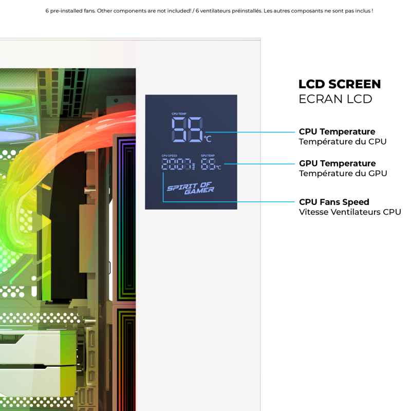 Un suivi en temps réel avec écran LCD intégré : VIPER CRX embarque un écran LCD frontal qui affiche en direct les informations essentielles de votre système. En utilisant l’application Spirit of Gamer, vous pouvez visualiser la température du processeur, la vitesse des ventilateurs et d’autres données clés, pour suivre l’état de votre machine tout en sublimant votre configuration.
