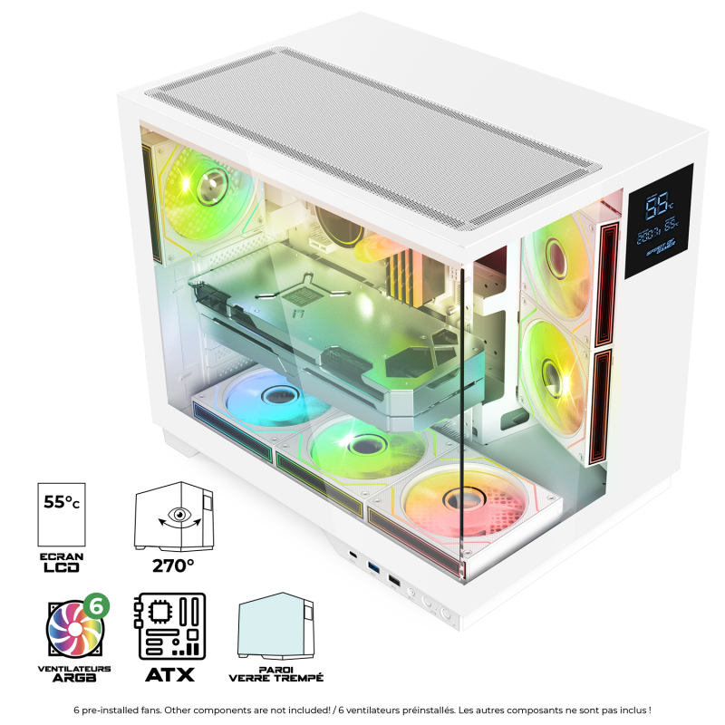 Un châssis haut de gamme pour les configurations extrêmes : VIPER CRX est conçu pour accueillir vos configurations les plus ambitieuses, compatible ATX, mATX et ITX. Avec une capacité graphique jusqu’à 390 mm et un ventirad CPU jusqu’à 165 mm, il offre tout l’espace nécessaire pour des composants puissants et évolutifs. Sa vue à 270°, grâce à sa façade et sa paroi en verre trempé, permet de mettre en valeur votre configuration ARGB et de profiter pleinement de votre setup gaming haut de gamme.