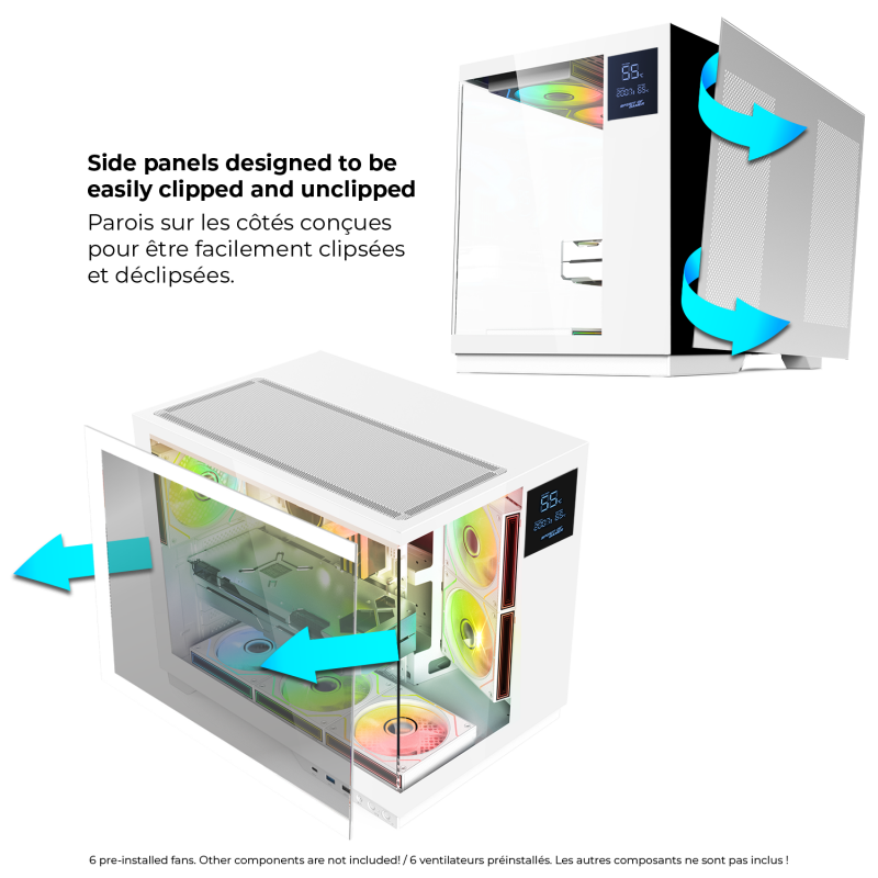 Un design robuste et pratique pensé pour les puristes : Avec son châssis en acier SPCC 0,8 mm et son système d’ouverture sans outil, le VIPER CRX offre une solidité haut de gamme et un entretien simplifié. Les filtres à poussière amovibles et le câble management intégré assurent un montage propre, tandis que son design en verre trempé met en valeur chaque détail de votre setup ARGB pour un effet visuel spectaculaire.