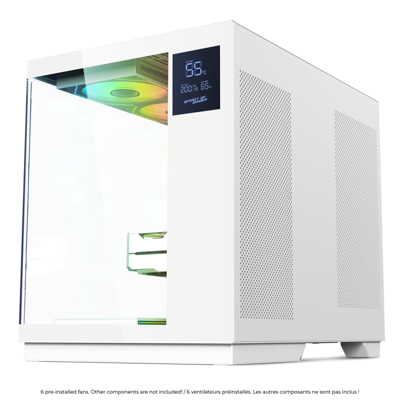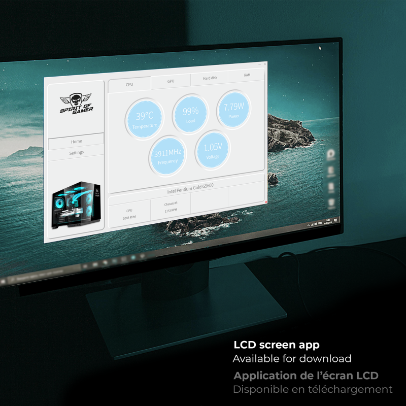 Téléchargeable depuis le site Spirit of Gamer, l'application permet d’activer l’écran LCD intégré et d'afficher en temps réel les informations système : température du processeur, vitesse des ventilateurs, et bien plus encore.