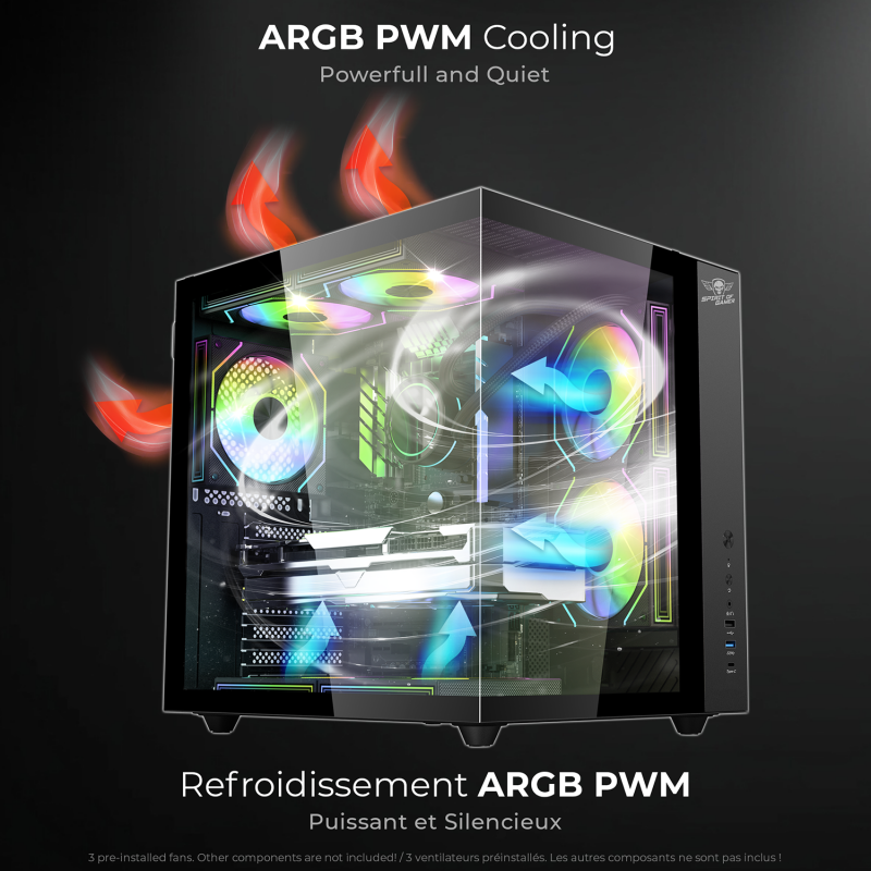 Un refroidissement ARGB performant et évolutif : BANDIT GT embarque trois ventilateurs ARGB préinstallés (2 latéraux et 1 arrière) pour assurer un flux d’air homogène et un refroidissement efficace dès l’installation. Il peut accueillir jusqu’à sept ventilateurs 120 mm et prend en charge un watercooling jusqu’à 240 mm sur la partie supérieure ou latérale. Grâce à ses filtres à poussière amovibles, le système reste propre et performant dans le temps, garantissant une température maîtrisée même lors des sessions de jeu les plus intenses.
