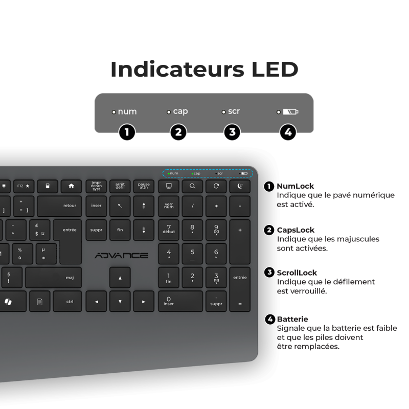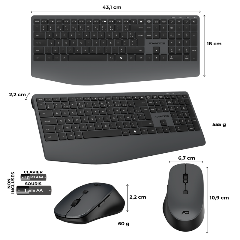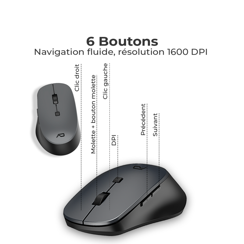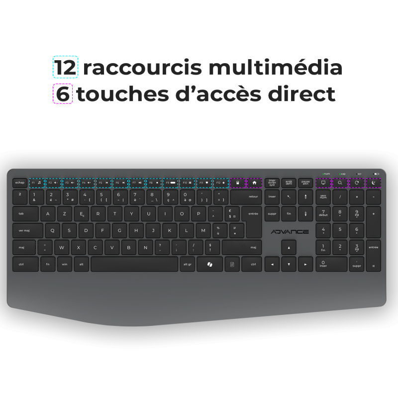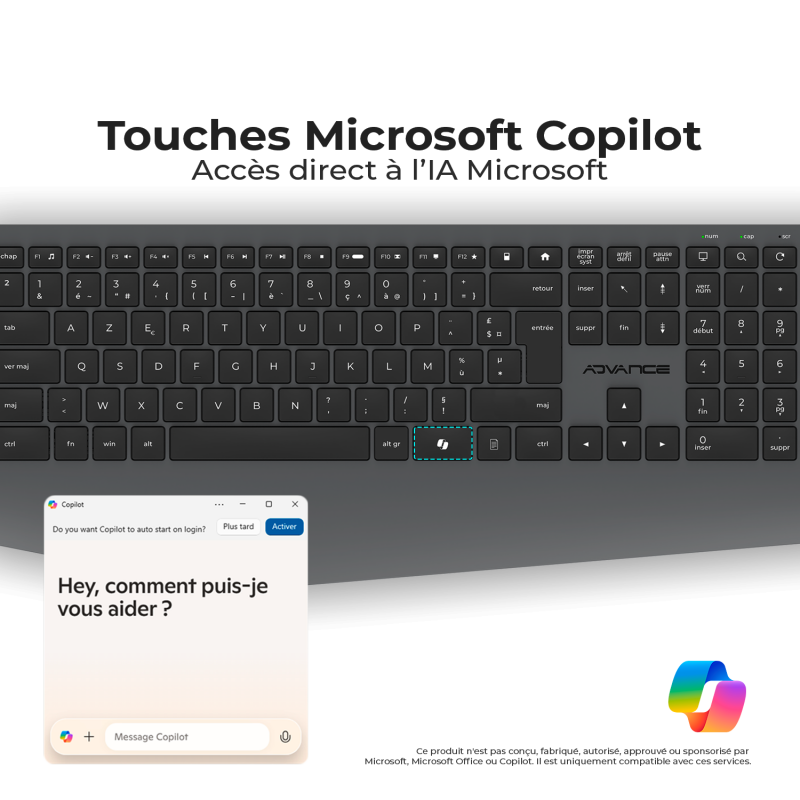 Performance personnalisée : Adaptez la résolution de la souris jusqu’à 1600 DPI pour une précision parfaite. Le clavier Azerty dispose de 6 touches dédiés (calculatrice...), 12 raccourcis multimédias et d’und accès direct à l’application Copilot AI de Microsoft, pour une expérience de travail moderne et intuitive.