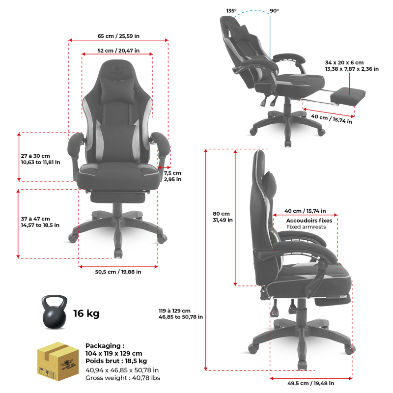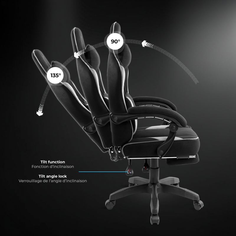 DÉTENTE SUR MESURE : Après la tension d’un match FIFA ou d’une session CS, place à la détente totale. Le repose-jambes escamotable de RAVEN se déploie en un geste, vous invitant à relâcher la pression. Le dossier inclinable de 90° à 135° s’ajuste selon vos envies : posture droite pour le jeu, position relax pour le streaming ou le repos. Ce siège devient votre espace personnel de confort et de récupération.