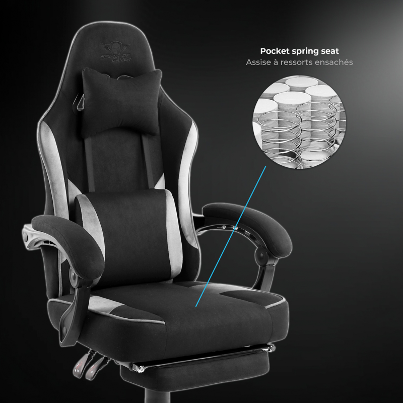 CONFORT DE NIVEAU PRO : L’assise de RAVEN est équipée de ressorts ensachés, une technologie inspirée du mobilier haut de gamme. Elle offre un maintien dynamique et durable, qui épouse vos mouvements tout en évitant la déformation dans le temps. Sa mousse haute densité (28D pour l’assise, 24D pour le dossier) ajoute une touche de moelleux maîtrisé, idéale pour les longues heures de jeu ou de travail.