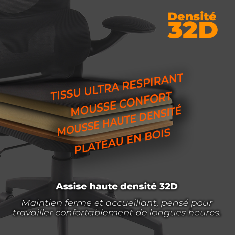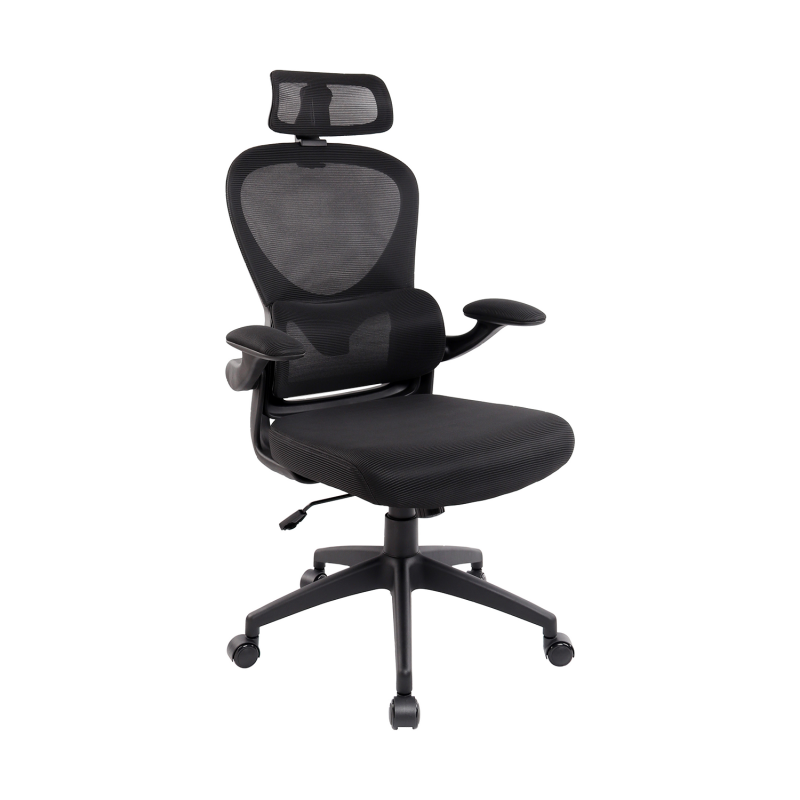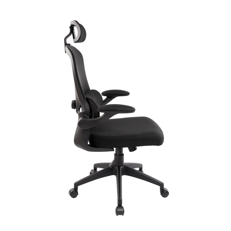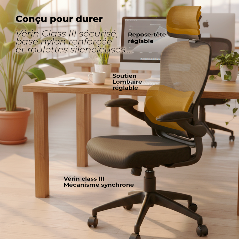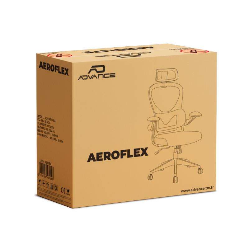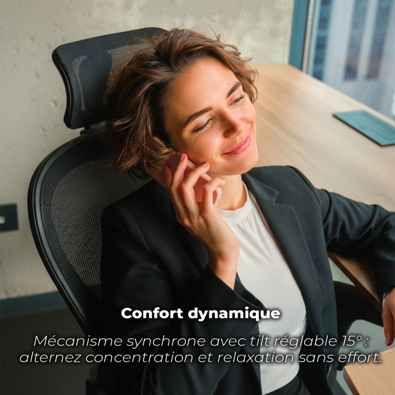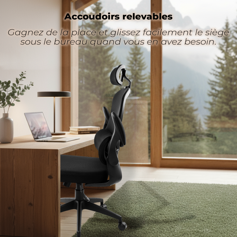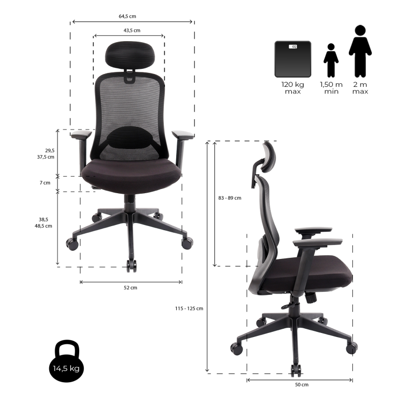 Accoudoirs : Relevables pour plus de flexibilité et de gain de place Assise : Mousse 32D, souple, durable et confortable Base : Nylon renforcé Ø 320 mm, conçue pour une stabilité optimale Dimensions (L x P x H) : 66 x 64 x 120–130 cm Dossier : Maille technique respirante pour une meilleure ventilation Mécanisme : Synchrone avec tension de basculement réglable (tilt 15°) Poids net : 12,5 kg Repose-tête : Intégré et réglable pour le confort des cervicales Roulettes : PU Ø 50 mm, silencieuses et adaptées tous types de sols Soutien lombaire : Réglable pour un maintien personnalisé du dos Utilisateur : Taille 150–180 cm / Poids max 100 kg Vérin : Class III, robuste et fiable