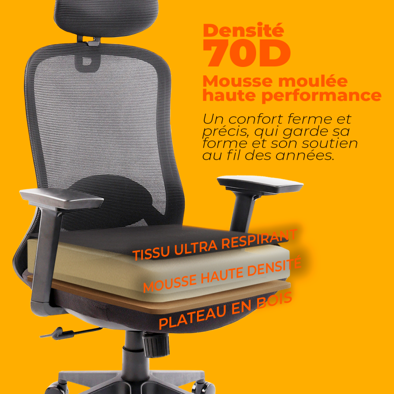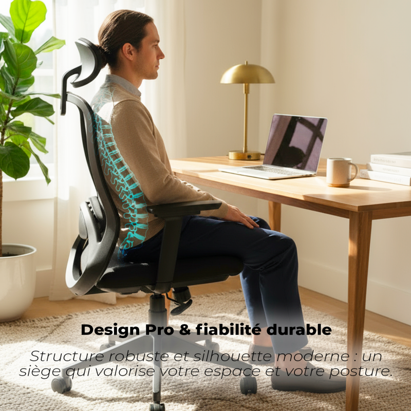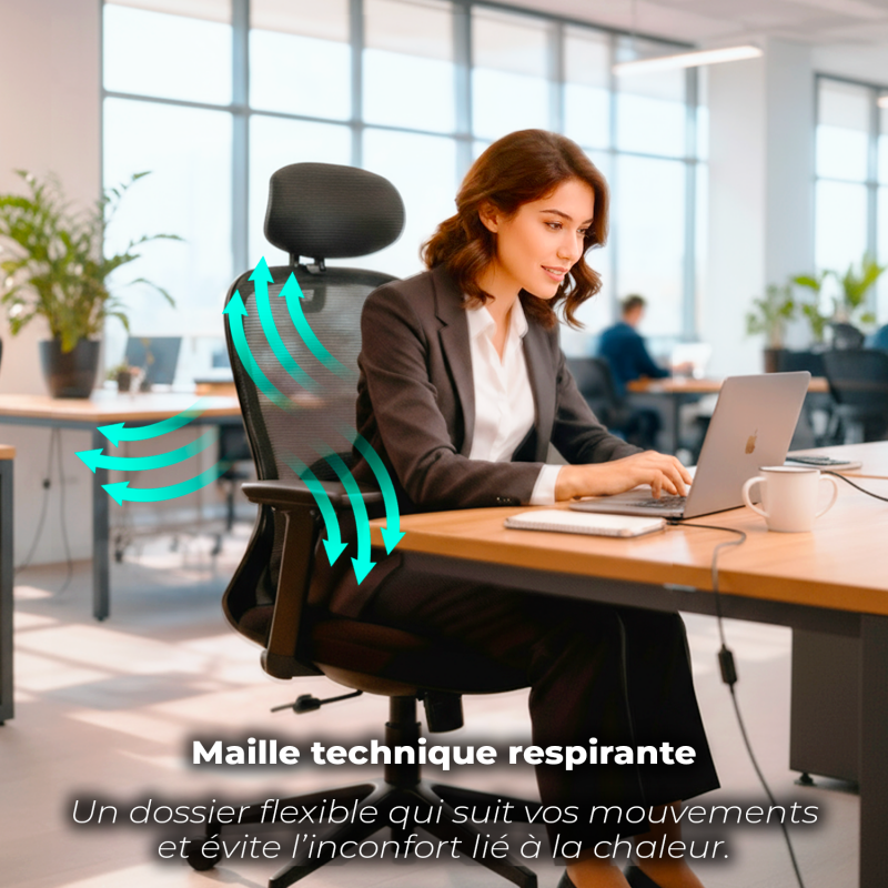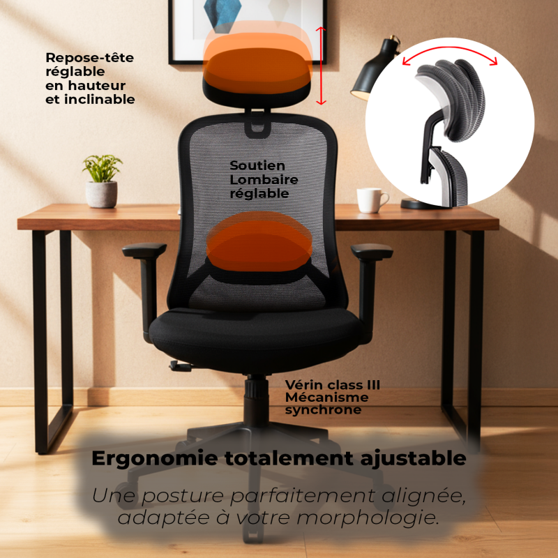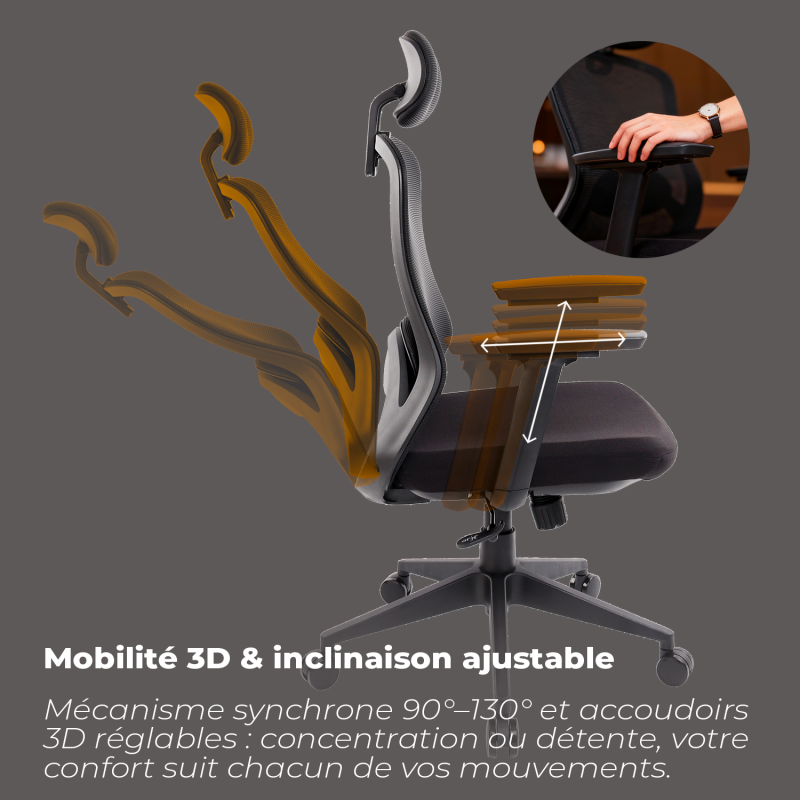 Accoudoirs : 3D réglables en hauteur, profondeur et orientables Assise : Mousse haute densité 70D, ultra-confortable et résistante Base : Nylon renforcé Ø 350 mm, offrant stabilité et durabilité Dimensions (L x P x H) : 66,2 x 56 x 118–128 cm Dossier : Maille technique respirante pour une aération constante Mécanisme : Synchrone avec tension de basculement réglable, inclinaison du dossier 90°–130° Poids net : 14,5 kg Repose-tête : Intégré et réglable pour le confort des cervicales Roulettes : PU Ø 60 mm, silencieuses et adaptées tous types de sols Soutien lombaire : Réglable pour un maintien ergonomique et précis du dos Utilisateur : Taille 150–180 cm / Poids max 120 kg Vérin : Class III, robuste et fiable