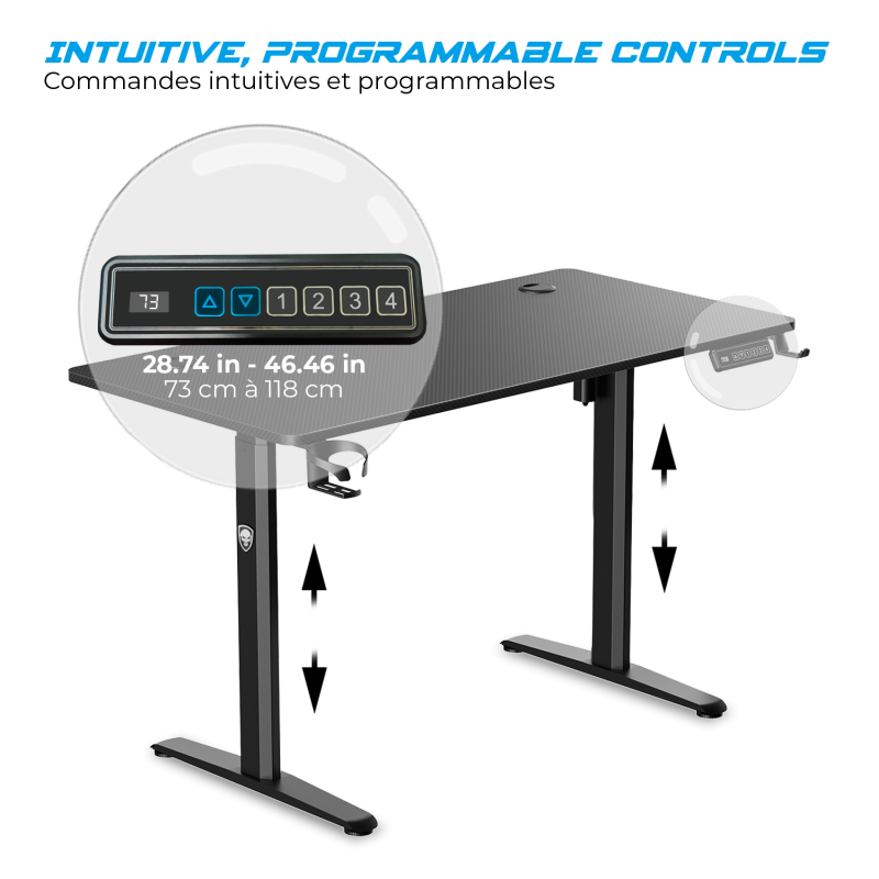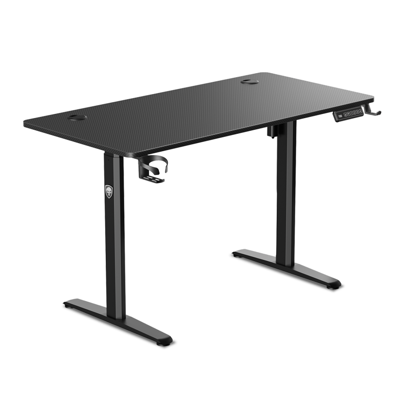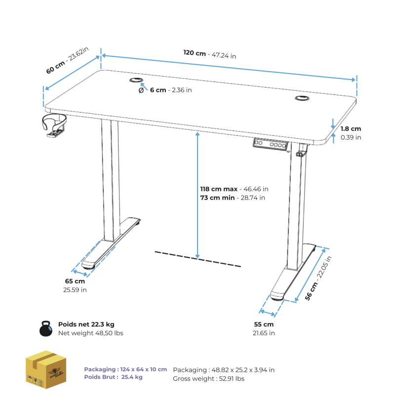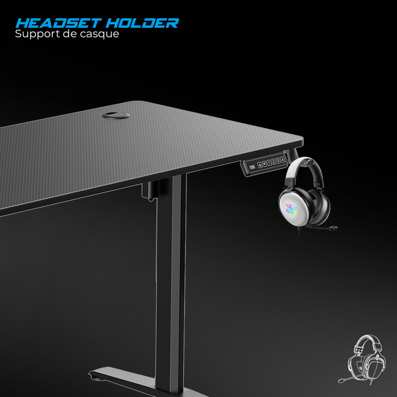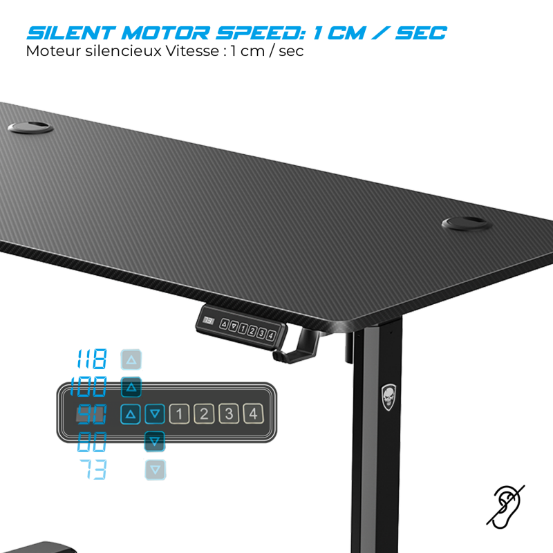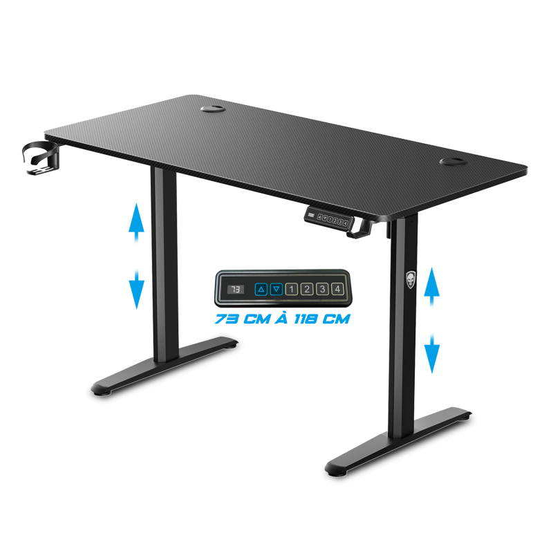 A compact and efficient tray! The 120 x 60 cm, made of MDF with carbon coating, offers sufficient space to accommodate your essential setup. Despite its compact size, it can support up to 60 kg, perfect for your screens, keyboards, mice and other accessories.