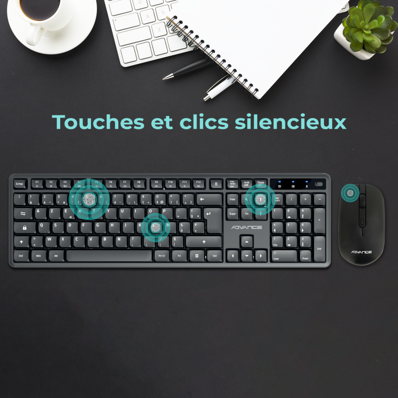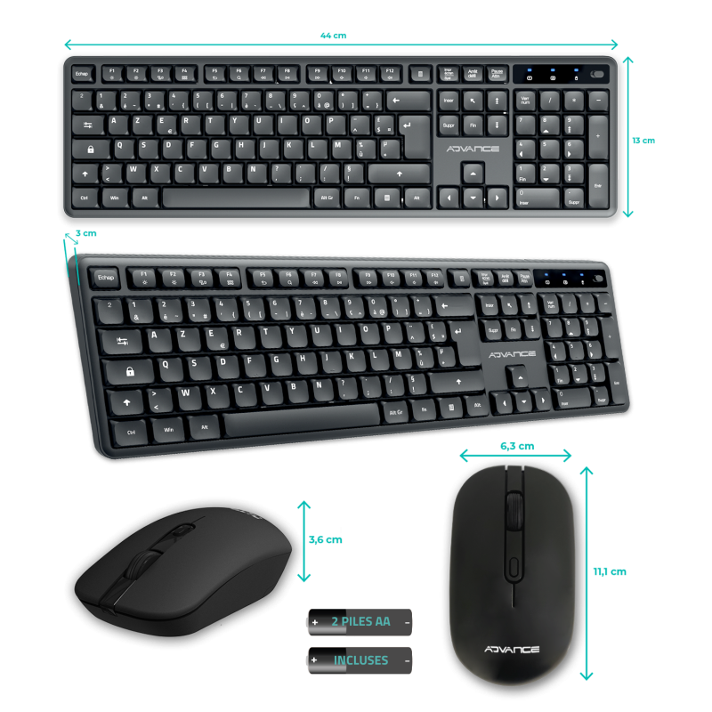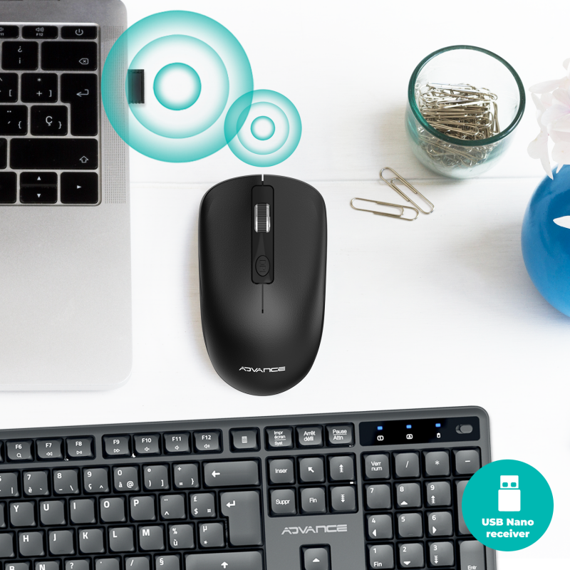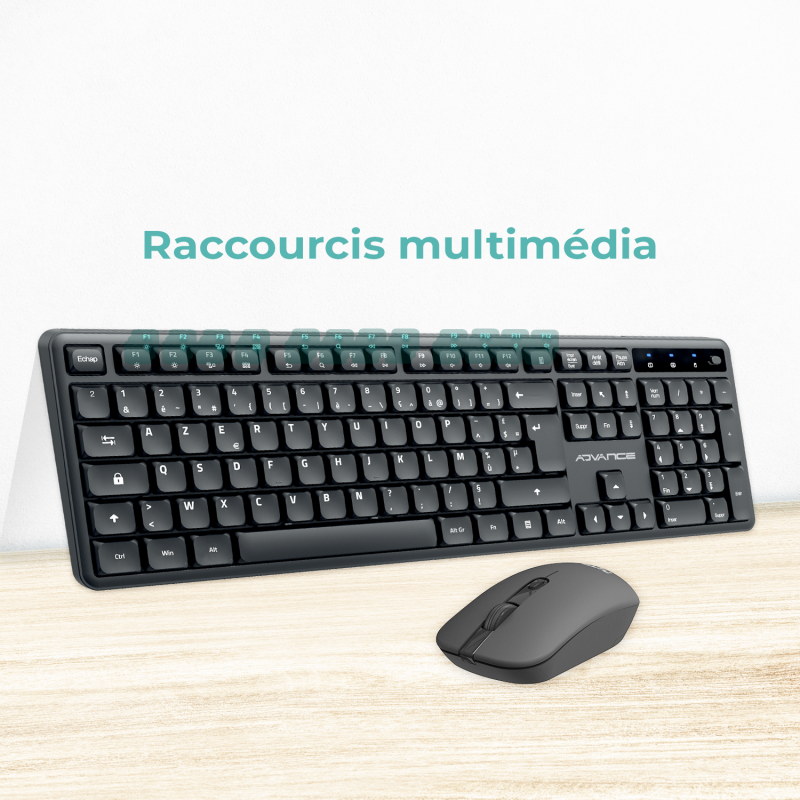 The 2.4 GHz wireless keyboard, on the other hand, offers 105 Azerty keys, including 19 anti-ghosting for precise and fast typing. Its quiet and ergonomic keys are perfect for working in calm. With 12 multimedia shortcuts and LED indicators, this keyboard combines practicality and modernity, while being powered by an included AA battery.