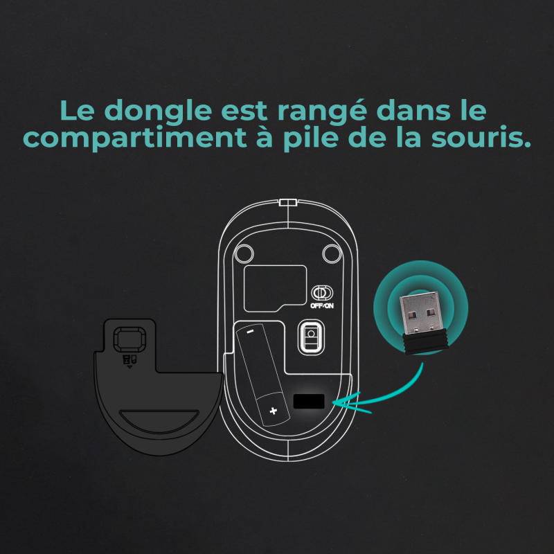 The 2.4 GHz wireless mouse offers great precision with an adjustable resolution up to 1600 DPI (800, 1000, 1200, 1600). Designed to suit both right-handed and left-handed users, it features 4 buttons and a scroll wheel for smooth navigation. Compact and lightweight, it is equipped with a nano USB receiver, a power-saving mode and an on/off button to optimize the battery life of its included AA battery.