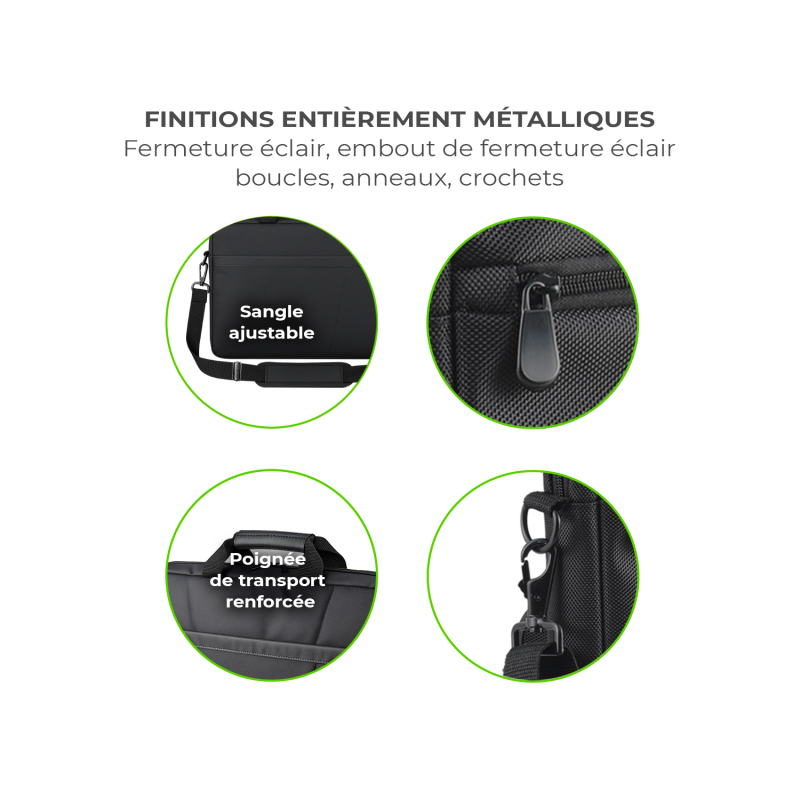 Discreet but essential details. The metal zippers, rings and carabiners, and especially the invisible zip of the main compartment, provide a neat and secure finish. Every detail has been thought out to combine aesthetics and performance.