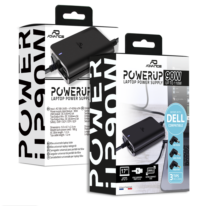 COMPATIBLE HP : Say goodbye to charging problems with PowerUp 90W for HP laptop*. This universal charger is equipped with three interchangeable connectors (TIPS), perfectly adapted to the various HP laptop models. No need to look for the specific charger compatible with your laptop.