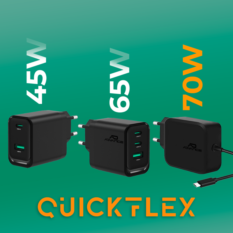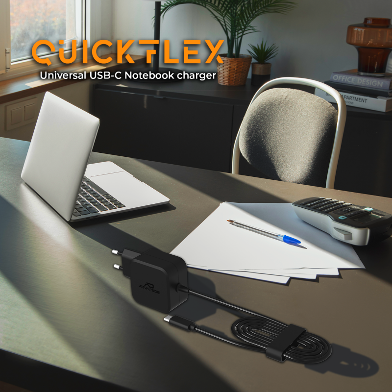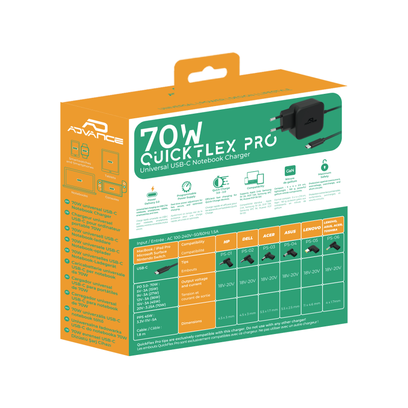 The QuickFlex Pro 70W from Advance is designed to simplify your digital daily life. Thanks to its USB-C connection and its 6 included tips, it powers a MacBook, a laptop, a smartphone, a tablet or a console: at home, in the office or on the move.