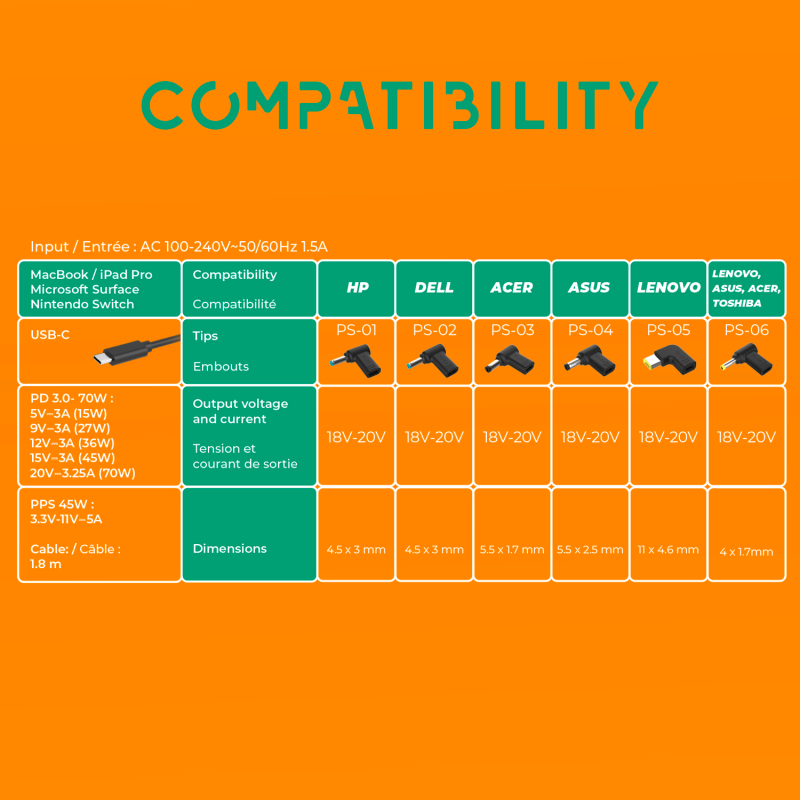 Whether you use HP, Dell, Lenovo, Microsoft Surface, MacBook, Samsung, Huawei or a Nintendo Switch, this charger adapts to your uses. It becomes the ideal ally for nomad pros, multitasking students and connected travelers.