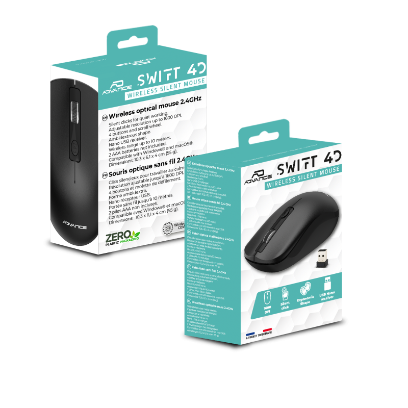 Ergonomic and practical design: With 4 buttons and a smooth scrolling wheel, the SWIFT 4D Wireless mouse offers exceptional comfort, whatever your use. Its ambidextrous design suits all users, ensuring a pleasant grip, whether you are right-handed or left-handed.