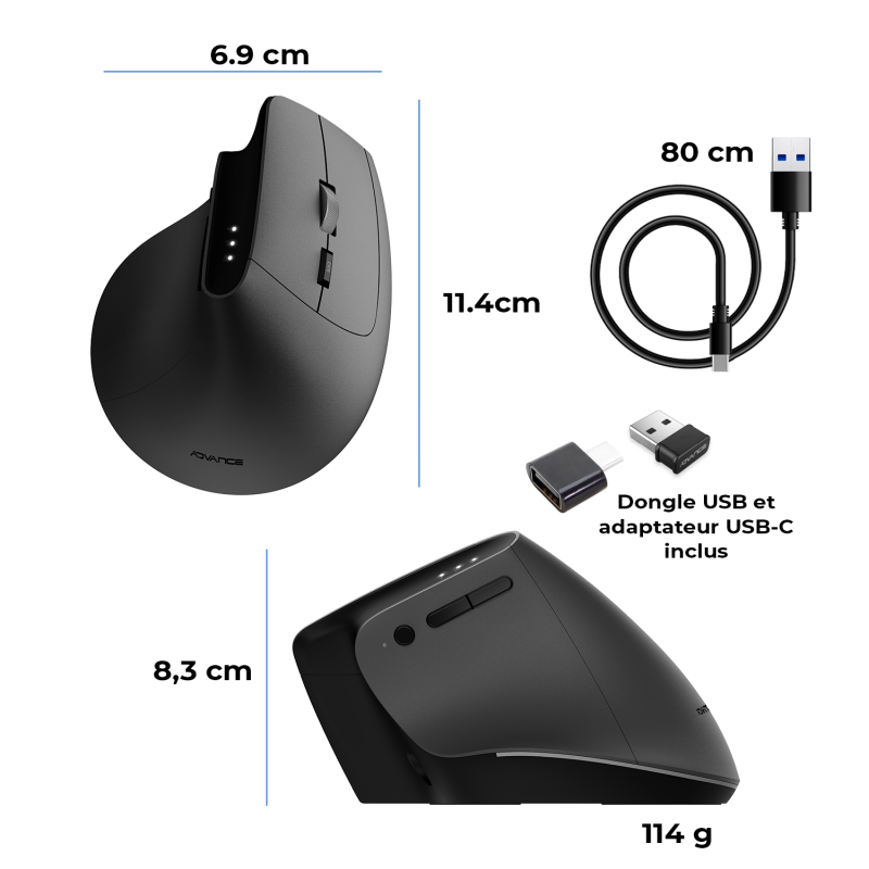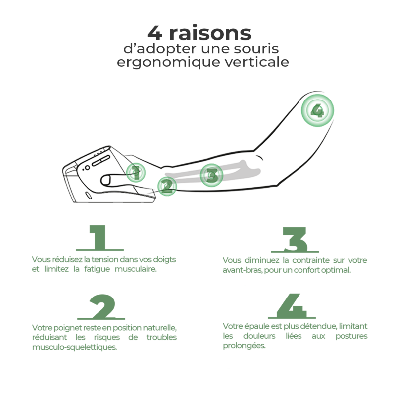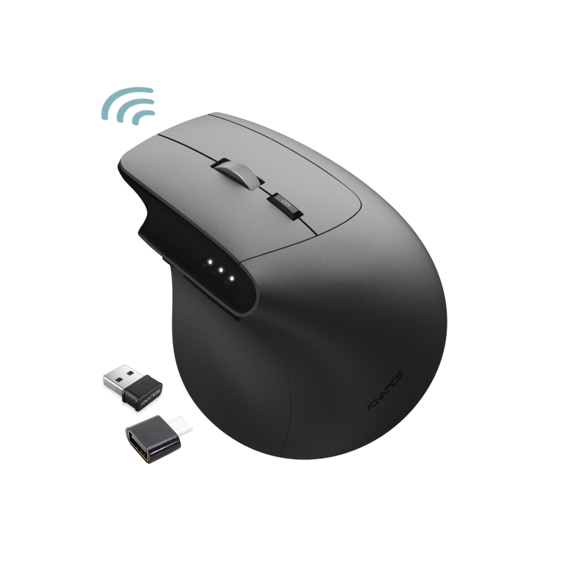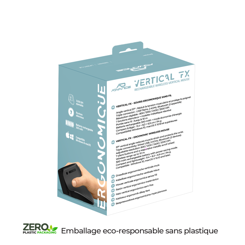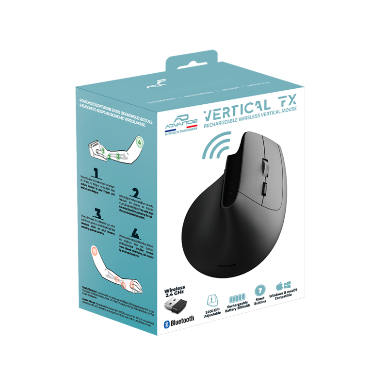 Discover a new way of working with Vertical FX, a wireless vertical mouse designed for your daily comfort. Its 57° ergonomic design promotes a natural forearm posture, reducing muscle tension and pain associated with long hours of work. Your hand remains relaxed, even after a full day in front of the screen.