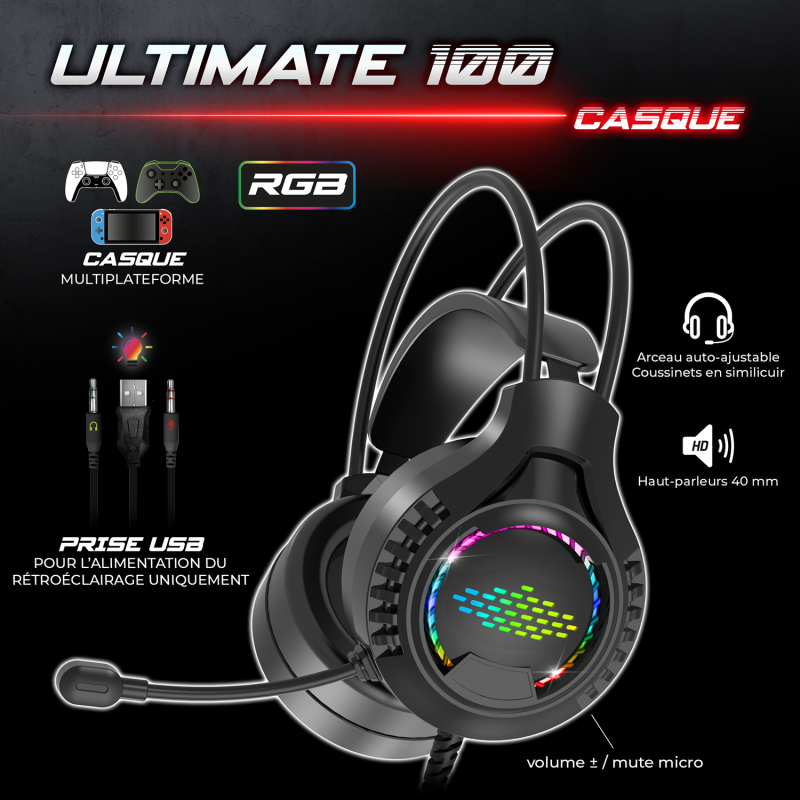 Dive into the atmosphere with the Ultimate 100 headset equipped with 40mm speakers for clear and powerful sound. Its self-adjusting headband, faux leather ear pads and integrated remote control guarantee comfort and control, while its RGB Rainbow backlight completes your setup. Hear your enemies, stay focused on victory.