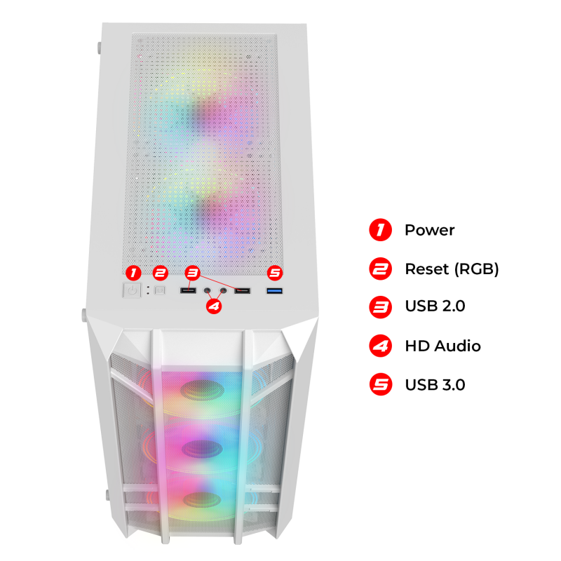 Complete connectivity at your fingertips: The front I/O panel provides 1 USB 3.0, 2 USB 2.0 and an HD audio jack for headphones and microphone. With its indicator LEDs, Power and Reset buttons, you maintain control of your setup with ease, ready to start your games at any time.