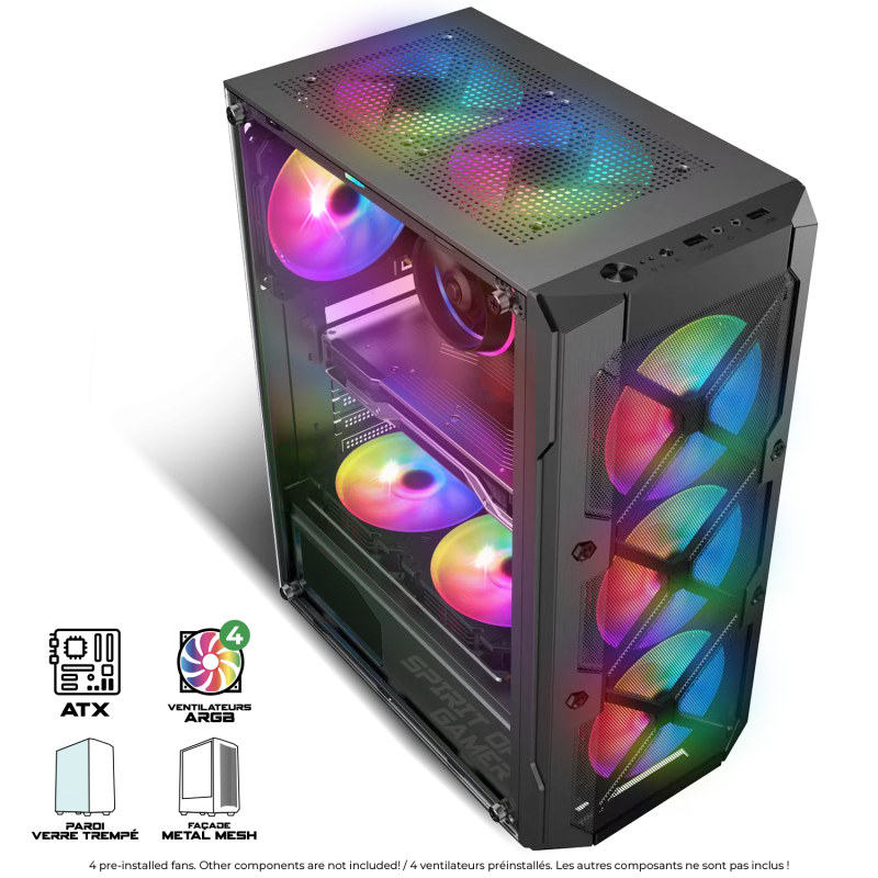 A powerful, customizable ARGB cooling system: With its 4 pre-installed 120 mm ARGB fans, REBEL XT combines effective cooling and captivating RGB style. It can accommodate up to 7 fans in total, including in the PSU compartment, and supports an AIO watercooling up to 240 mm at the front, ensuring stable temperatures even during long, intense gaming sessions. Aesthetically, enjoy 14 built-in RGB modes or synchronize the ARGB backlighting with compatible motherboards: ASUS Aura Sync, RGB Fusion Ready, MSI Mystic Light Sync... to create a unique RGB atmosphere perfectly coordinated with the rest of your setup.