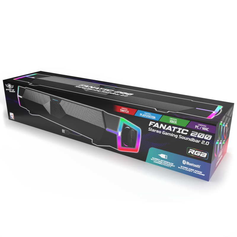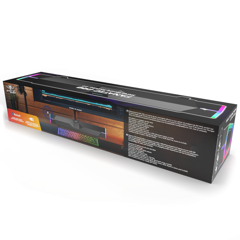Step into the arena with Fanatic 200, a compact soundbar that unleashes the full power of a 6W RMS 2.0 stereo sound. Thanks to 3D Sound technology, you feel every sound detail with deadly precision, from stealthy footsteps to devastating explosions. Every moment becomes more intense, every victory more satisfying.